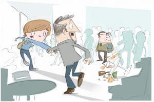 We both stood up at the same time and I instinctively reached out and pulled him close to me as figures scuttled back and forth, nobody quite sure where to go. Watkins was intermittently visible in the centre of the room, trying to maintain some sort of order. His voice occasionally floated above the din; “Try and leave the premises in an orderly fashion… Oh dear… evacuation point in the car park…”