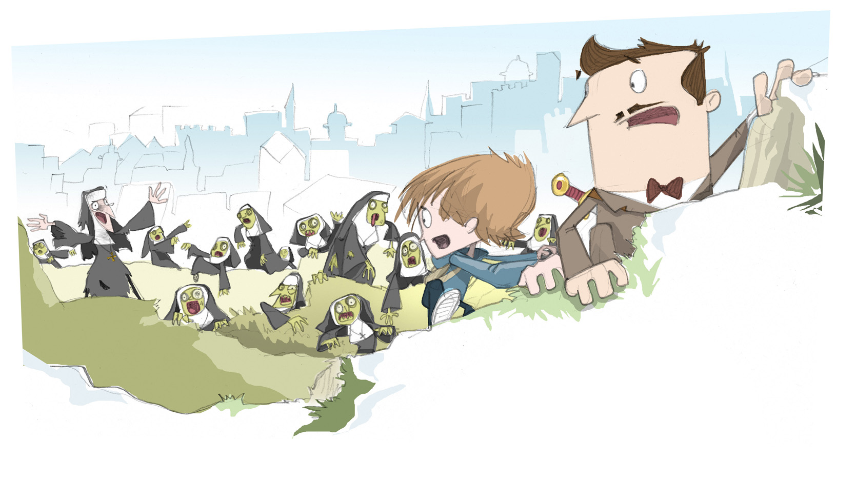 But then there came the sound from below again and this time it was unmistakable – a familiar collective groan carried up on the wind. Michael and I both turned and stared fearfully back down the path. A moment of unbearable stillness and then suddenly it appeared. A vast horde of undead flesh, swathed in black and white and scurrying up over the rocks with preternatural speed. And in the centre, harrying, cajoling and directing them, was the gaunt figure of the Reverend Mother herself. Her eager eyes scanning over the mountain soon came to rest upon us and her face lit up in a ghoulish smile.