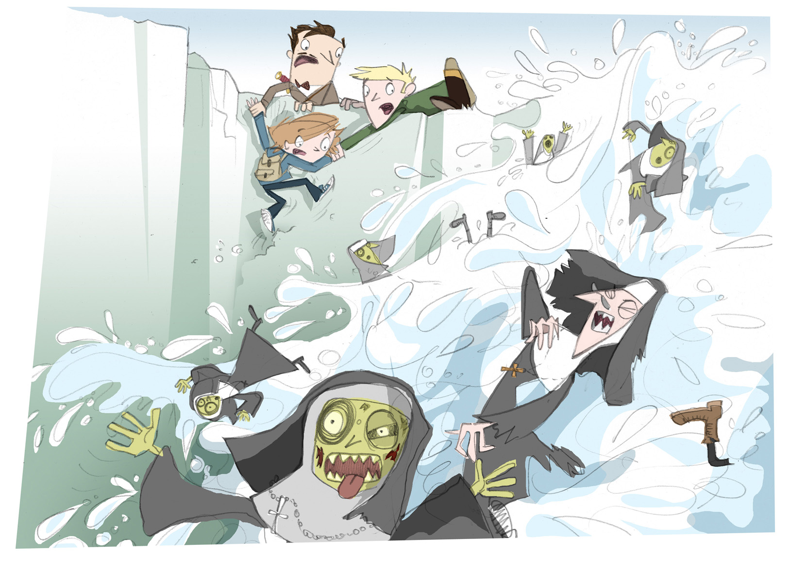 Collapsing breathlessly onto the ledge I rolled over and peered down just in time to see the Reverend Mother and all her zombie sisters swept helplessly off the side of the mountain by a cascade of icy water.