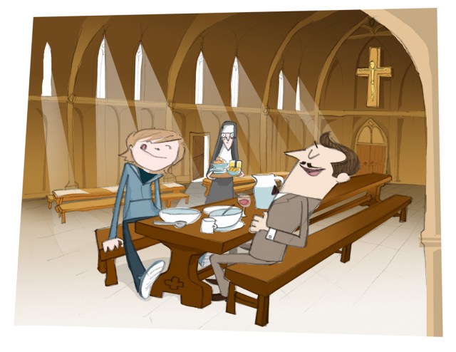 She’d led us across the courtyard to a spacious dining hall dominated by a vast wooden crucifix hanging from the wall at one end. We were seated at the end of one of the polished dining tables that ran the length of the room and the Reverend Mother served us herself, periodically vanishing through a heavy wooden door at the side to bring forth more food. To be honest, judging from the pallid cast of our hostess’s face I hadn’t been expecting a whole lot from the catering. But after just a few mouthfuls I was prepared to put her pasty complexion down to the fact that nuns probably didn’t get out much. The food was utterly delicious.