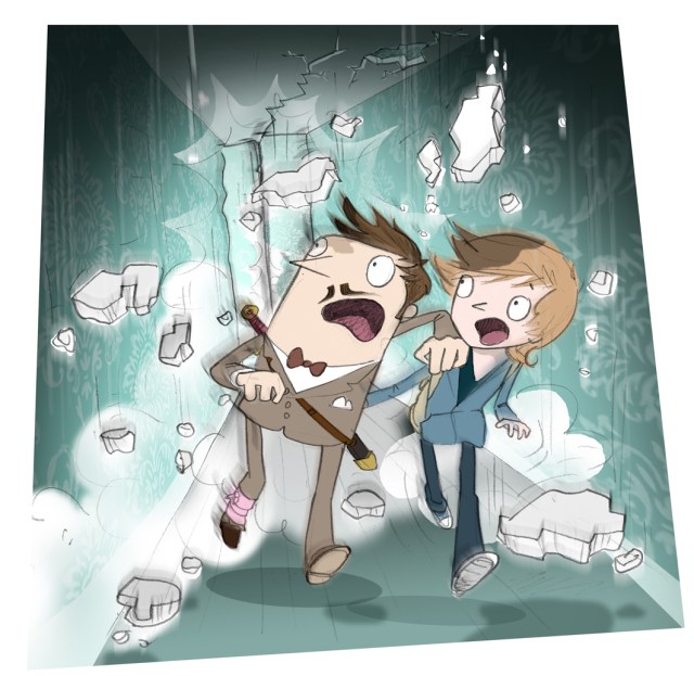 Doing our best to ignore the lumps of masonry tumbling from the ceiling and the floor juddering beneath our feet, Michael and I stumbled towards the door. The creaking noise began to rise again either side of us. With the doorway in touching distance I closed my eyes and hurled myself and Michael forward.