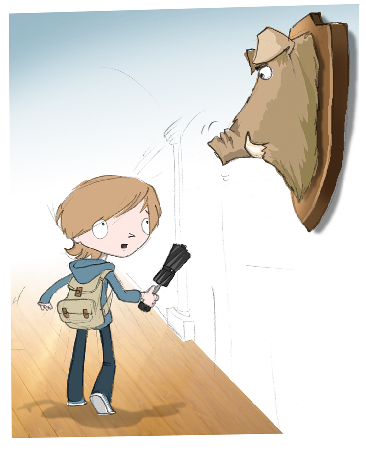 In this fashion we had travelled about half the length of the hall when I was distracted by a hint of movement on the wall beside me. Finding myself alongside the fireplace, my eyes immediately strayed to the trio of boar’s heads who looked down from above. Catching sight of their dark eyes and long, curling teeth I stopped and clutched my brolly a little tighter.