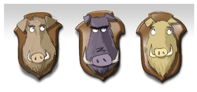 Slowly he raised his eyes to the ceiling before looking back down at me and shaking his head. I stared back with a puzzled frown, entirely mystified. With the expression of an exhausted teacher dealing with an especially slow pupil, the boar looked to the right, then to the left. Slowly, all three of the boars together raised their eyes to the ceiling before looking back at me and shaking their heads. I could only offer up a baffled shrug in return.
