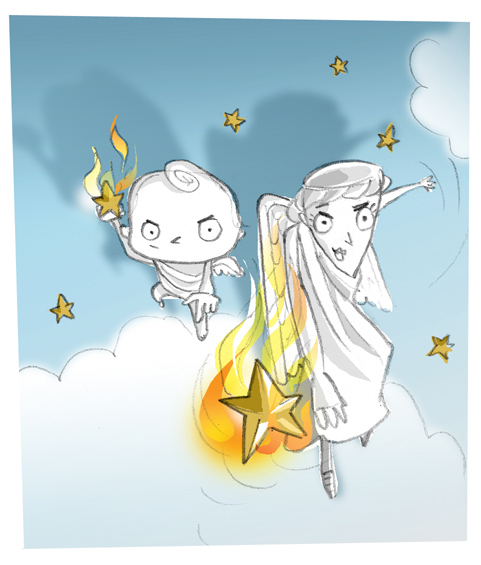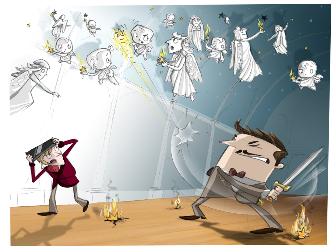 There was an alarmed screech from Horace and a weary groan from Michael as more stars hit the floor with a loud ping. Horace backed himself up against the far wall and tried to fit as much of himself as he could beneath his piece of piano lid. I backed into the relative safety of the fireplace. Unfortunately, stuck in the middle of the floor, Michael found himself somewhat isolated. Using the flat of his sword in the style of a cricket bat he managed to send one falling star pinging back in the direction from which it had come but, sensing blood, the cherubs and angels were now swarming malevolently in his direction.