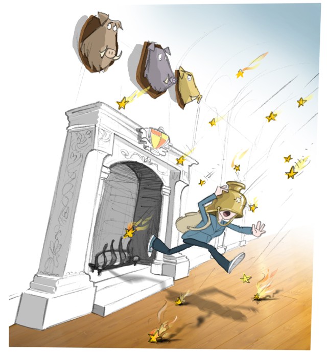 What could have been a painfully lengthy process of inter-species communication was abruptly cut short by something sharp and shiny which plummeted from the ceiling with some considerable force. It crashed to the floor just inches from my feet. I looked up and instantly I realised the boar’s warning. High up above me the carved cherubs and angels that had hitherto posed serenely around the ceiling were swarming menacingly across the beams. They were gathering in small clusters here and there to prise free the painted stars and hurl them viciously down below. Wrenched from their decorative platform the stars flew to the ground as tiny rocks of molten fire. I stepped aside just in time as another plunged down and left a devastating scorch mark almost exactly where I had been standing.