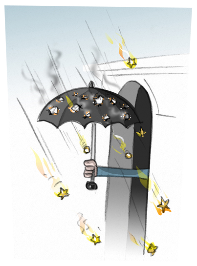 A shower of stars were immediately launched and ripped through the canvas covering with distressing ease. By the time I retreated to the back of the fireplace my brolly bore more resemblance to a sieve than an umbrella. Reluctantly, I returned the shattered remnants to my bag and looked for an alternative means of protection.