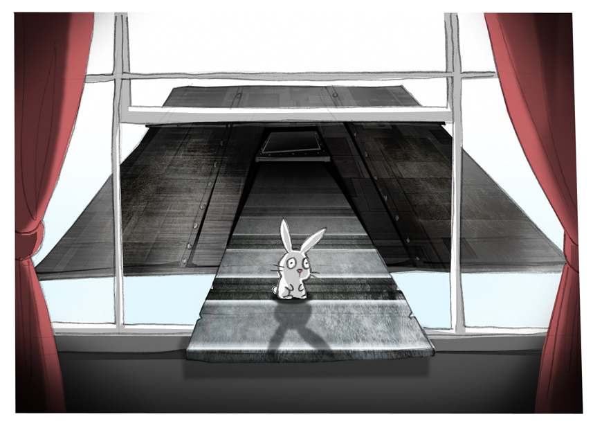 There was a crunching of mechanical gears and a door in the side of the craft slowly rose. For a moment nothing could be seen inside except a great gaping blackness. Then there was a shuffling sound from within. There was a nerve-racking pause and then, to everyone’s astonishment, a small white rabbit appeared in the doorway of the machine. It sniffed the air uncertainly for a moment and then hopped down into Freud’s office.