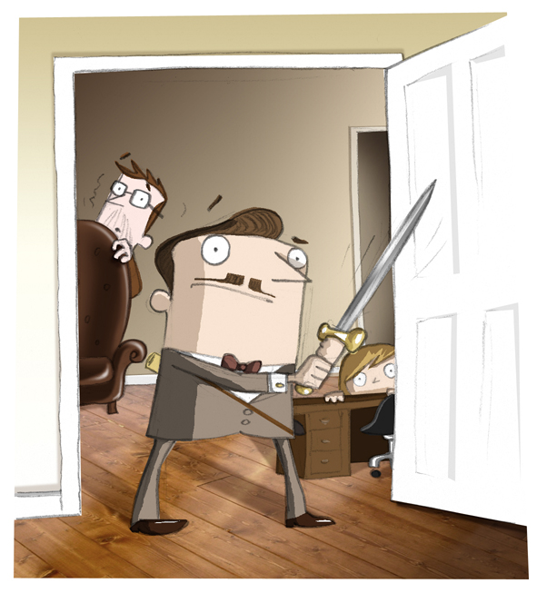 It was at this point that Carol made a rather ungainly dive for the safety of her reception desk. Martin Croft shook his head unhappily and ducked back down behind his brown leather armchair. Michael hesitated for a moment, then drew his sword and took up a defensive posture by the doorway. I made a mental note not to be so swift in future to taunt small, demented megalomaniacs.