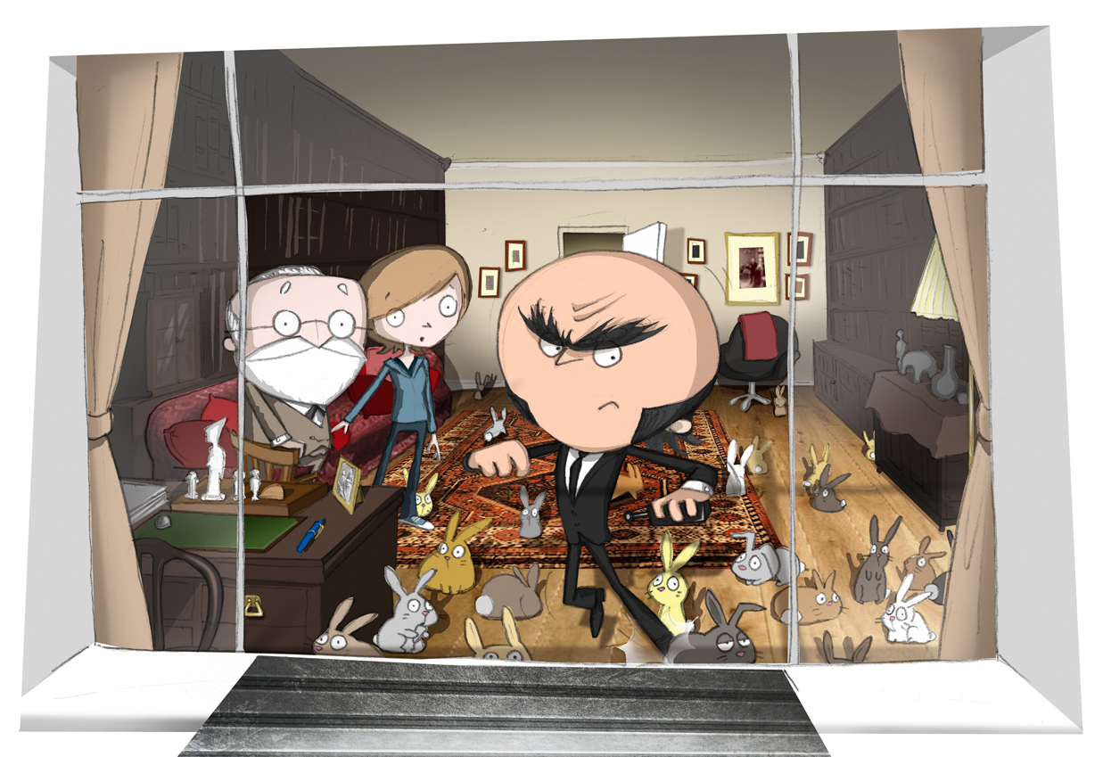 Still far too stunned to make any sort of move to stop him, we all simply watched as, tripping over one or two rabbits along the way, he walked over to the window with as much dignity as he could muster. He paused there for a moment, waving his gadget menacingly and called out, “I am Svankmeyer and I will be obeyed!” Then he clambered aboard his flying machine.