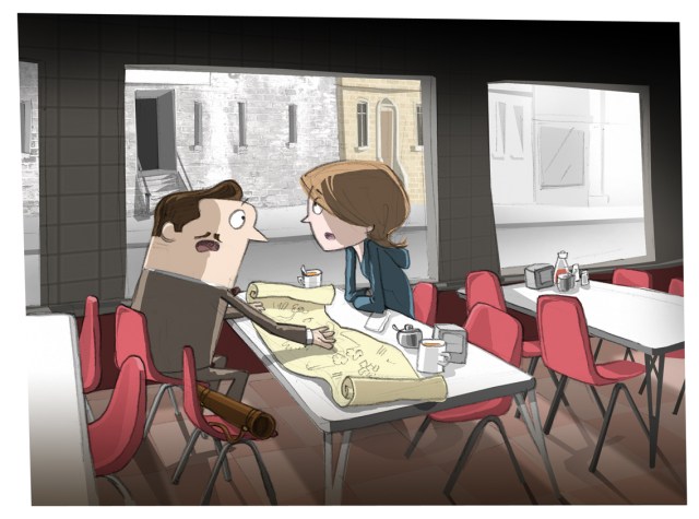 I sat at a table by the window and stared at the now blank sign that hung over the doorway across the road. Upon leaving the empty Explorer’s Club, somewhat dazed and confused, I’d been rather grateful to discover a café directly opposite. But as I stared out I began to find something strangely sinister about the vacant sign and blank, staring windows that confronted me from across the street. I turned to picking distractedly at the Formica table top, an activity I was still engaged in when Michael returned from the counter and set down two large mugs of tea.