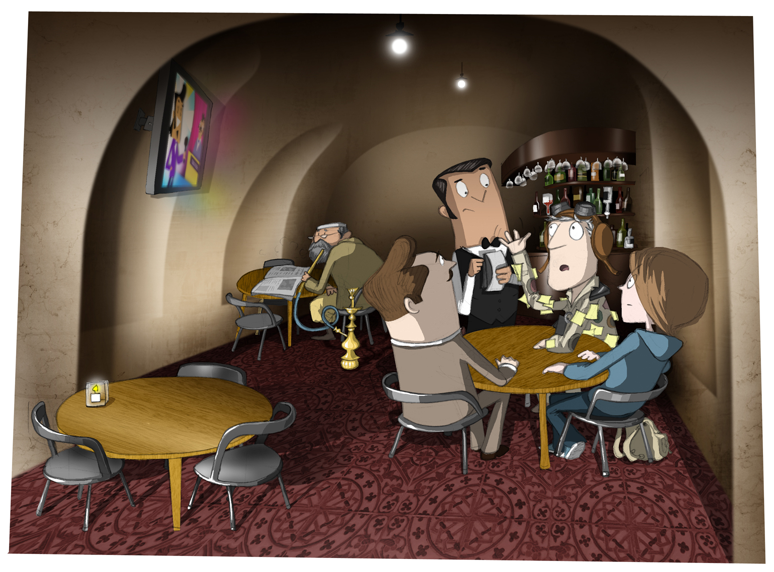 Colonel Pendlebury excitedly clapped his hands together. “I say, this will be an adventure,” he exclaimed. “How about a drink to celebrate?” He glanced around the café with a puzzled expression before his eyes fell on the waiter, seated at the bar and still tucked behind his newspaper. “Honestly, you’d think someone might have offered to take our order by now,” complained Colonel Pendlebury loudly. “The service in this place is a joke.”