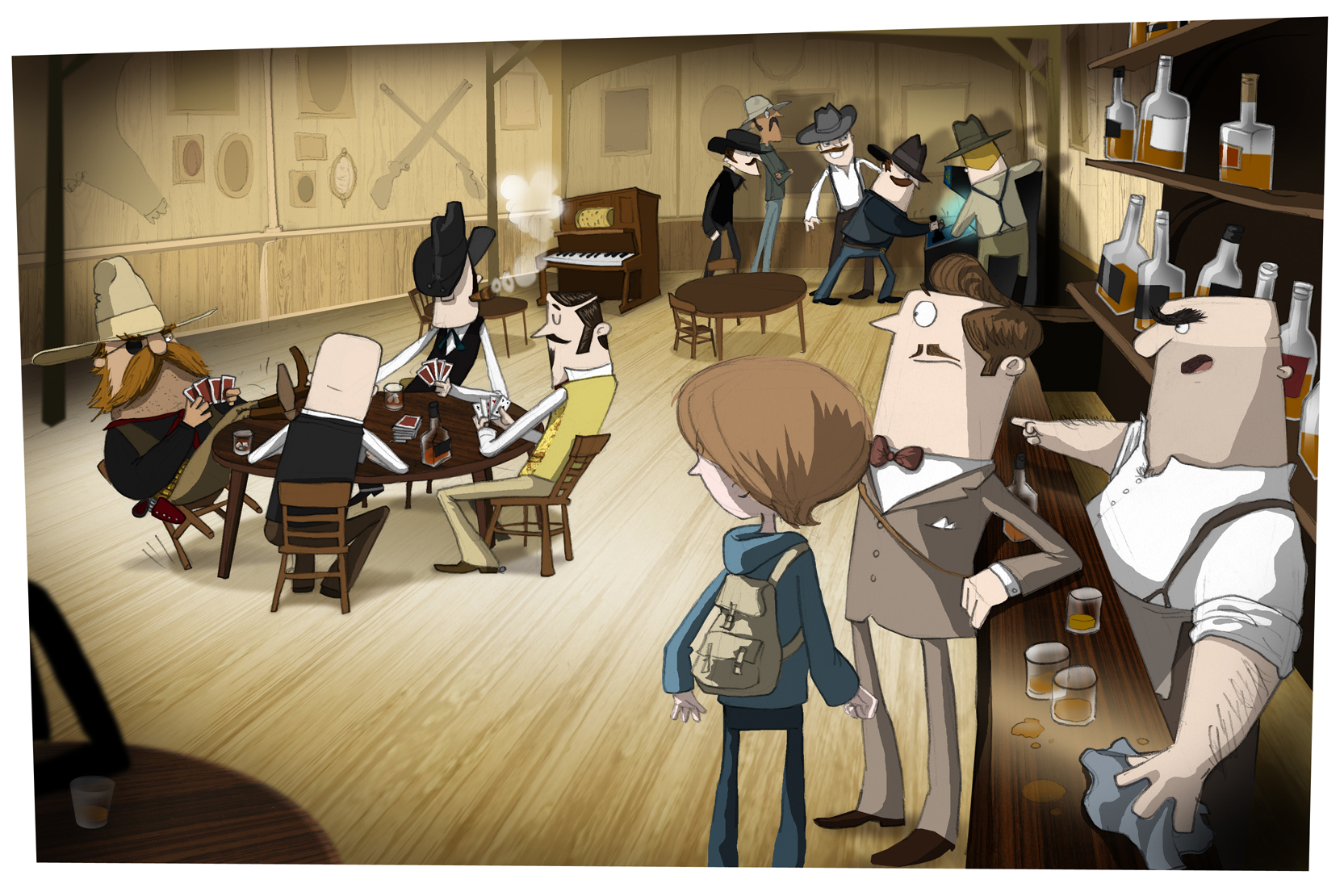 The interior of the saloon bar was bright and noisy. Variously be-hatted patrons supped whisky at tables scattered across a sawdust-strewn floor and in one corner a player-less Pianola decanted a jaunty tune. I noticed with a degree of bemusement that in another corner a group of young men were gathered around a 1980s style Space Invaders machine. Frank had clearly not been wrong when he suggested that things were apt to get a bit confused around here. I was relieved at least to note that strangers didn’t appear much of a concern to the regular clientele for we merited no more than a cursory glance or two as we followed Colonel Pendlebury over to the bar.