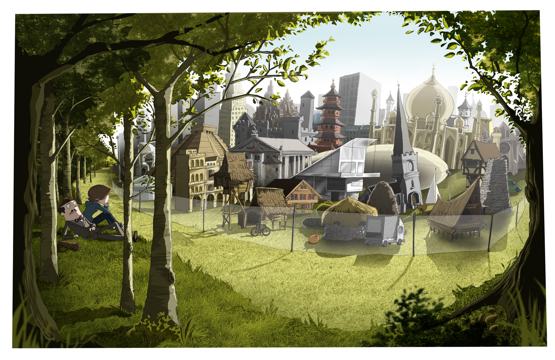 They came upon the barracks of the Explorers Club in a clearing in the midst of a dense forest. The site covered a few acres and was encircled by a slender, razor sharp wire fence which glinted dangerously in the sunshine. That these were no ordinary barracks was immediately apparent from a quick survey of the buildings within the wire. Not for the Explorers Club the austere uniformity usually expected of any location bearing such a military title. Instead their compound was made up of the most extraordinary assembly of structures ever seen. There appeared to be specimens from every region and every era, as though it were the collection of an indiscriminate antiques hunter working on a grand scale. Stone huts lodged against modernist glass houses and medieval towers nestled alongside ornate wooden pagodas. In and around these buildings could be spotted an array of vehicles; cars, trucks, motorcycles. A small yacht sat, uncomfortably beached, in the shadow of…