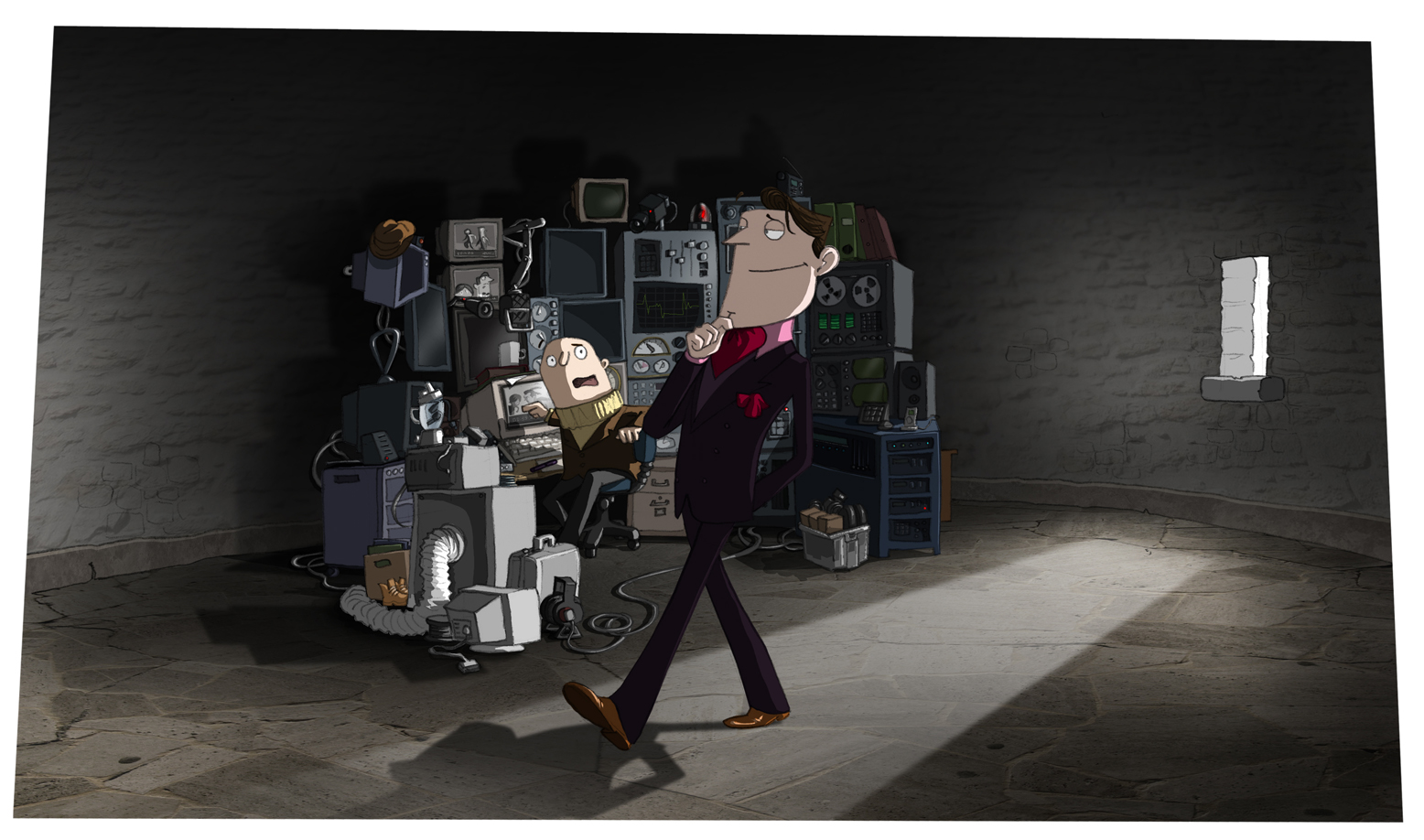 The second man, named Kenneth, would make no such claims on anyone’s attention. He was not perhaps what you would call downright ugly but his face lacked any strength of feature, being altogether too soft and spongy to be particularly pleasant to look upon. In fact his flesh as a whole had a disagreeably malleable quality to it, as though it had been moulded only temporarily into its present form and might melt at any moment into a shapeless puddle on the floor. Kenneth was seated at a desk in front of a confusing assembly of technological equipment. He tapped nervously on the table with nicotine stained fingers whilst his eyes flicked anxiously between monitors and dials.