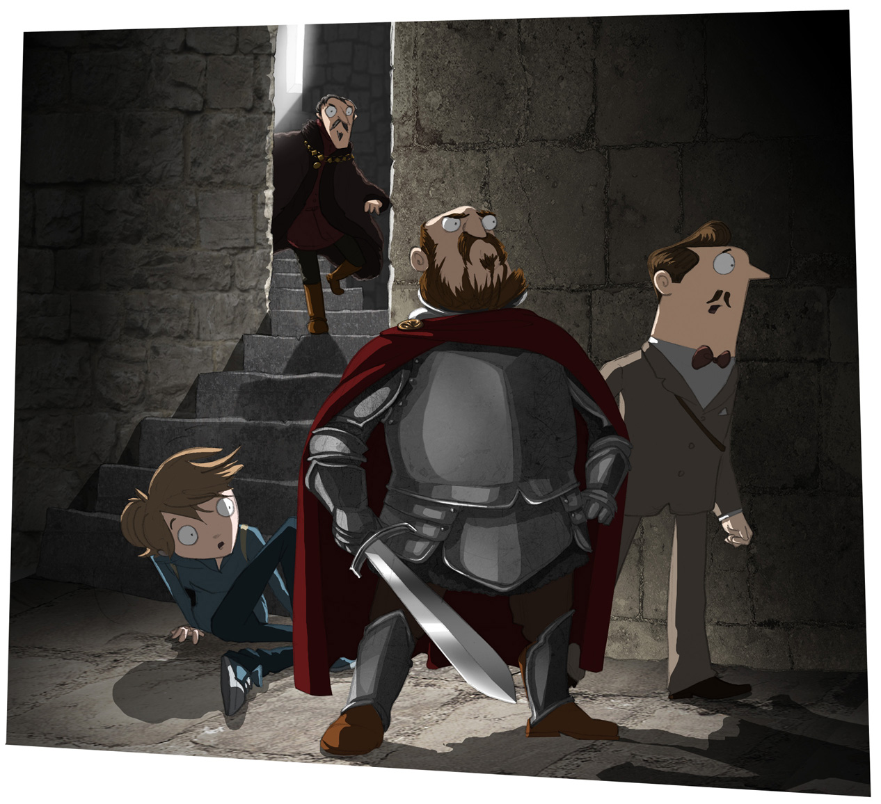 A sharp nod of understanding from the Captain and he led the way over to where the shadows concealed a low archway leading onto a slippery set of steep stone steps. We followed the rough stairway as it burrowed into the very bowels of the Chateau before opening out onto a small damp chamber. In the middle of this chamber, illuminated by distant sunlight which poured down from a narrow chimney, stood a circular stone well. And in front of the well, his eyes flicking nervously around the room, stood Guillaume.