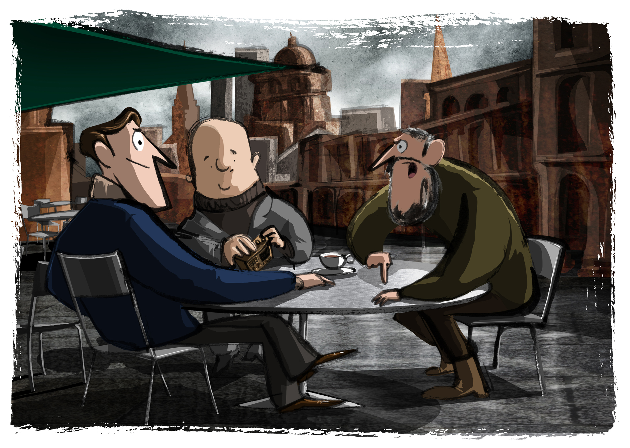 Just two men sit out the morning, sharing a table at the end of the row. The first is tall and handsome, sporting a taupe polo-neck sweater beneath a navy blazer. The second is a shapeless man in a shapeless suit; his bald head sinks directly onto his shoulders without benefit of any discernible neck to support it. What little conversation they have is long since used up by lunchtime but they sit on into the afternoon, watching and waiting.