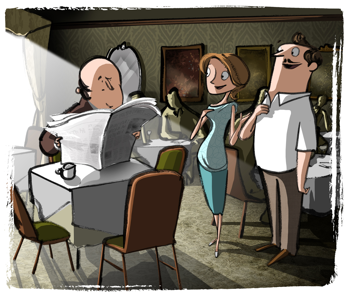 “I don’t see why you should,” I countered. “He doesn’t exactly look engrossed by that newspaper.”