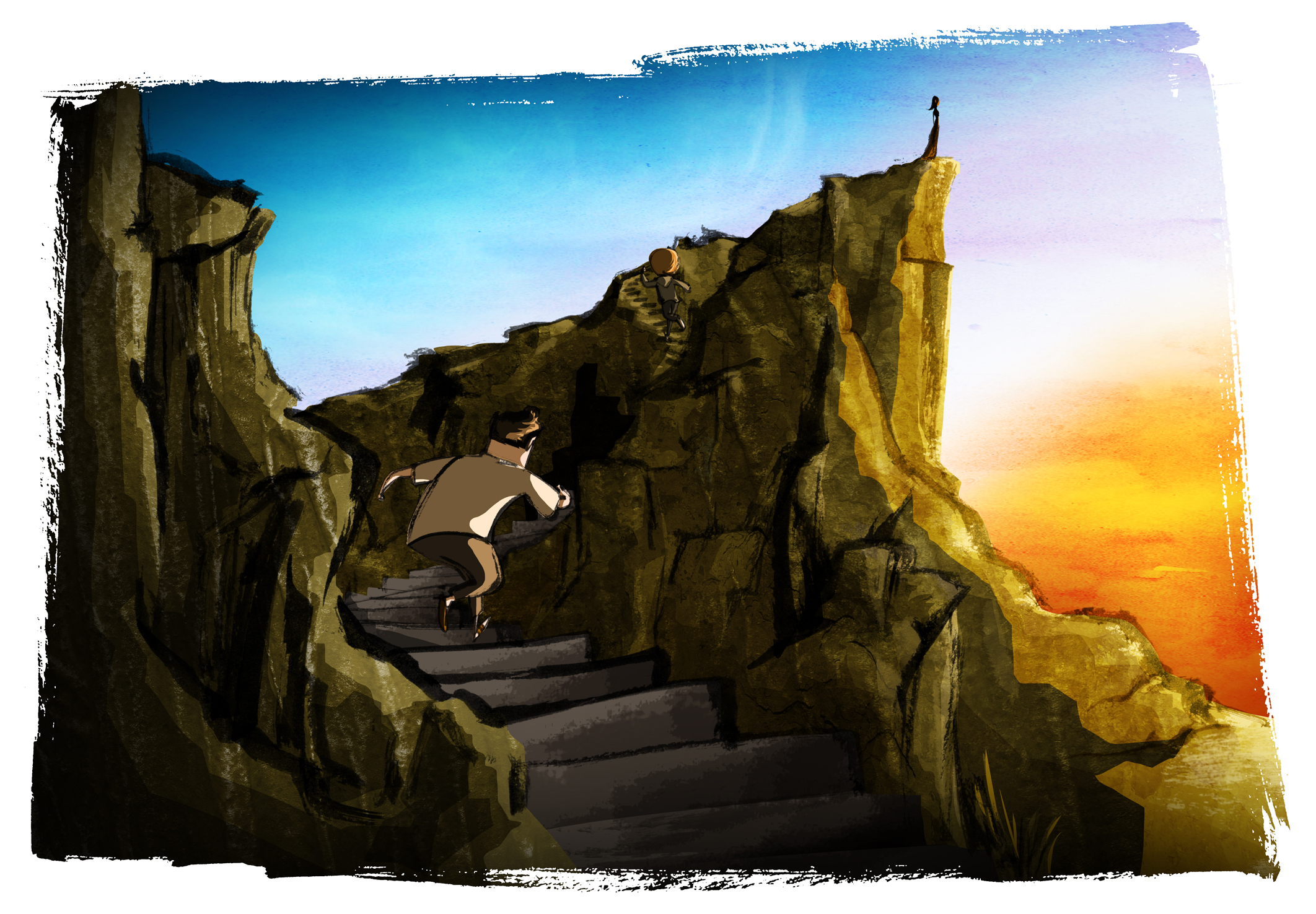 We set off up the cliff path at the double. The dark lady appeared immobile enough for now but I knew from experience that she had a habit of suddenly melting away into the shadows. The stone pathway twisted and turned as it rose, hugging tight to the side of the cliff, so that the woman flickered in and out of view as we climbed.