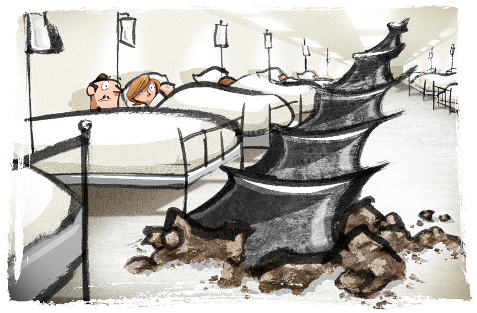 Michael and I shuffled hurriedly backwards and instinctively ducked down behind one of the hospital beds as this process was repeated several more times. Eventually, the drill having been worked around until it had opened up a gaping black hole in the middle of the floor, it disappeared back down below one last time and the dull roar of its motor was silenced.