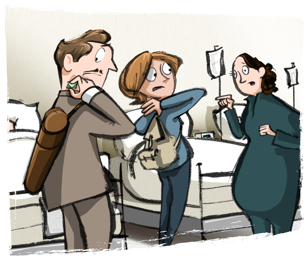 We peered curiously over the top of a blissfully sleeping patient to see two hands next reach up out of the freshly made hole and a tall slender woman in dark overalls pulled herself nimbly up onto the floor above. The woman, who was about thirty-ish with blonde hair pulled back into a severe ponytail, paused just long enough for a cursory glance around the room, dusting herself off, before she reached down to help a second figure up out of the hole. This proved to be another woman of about the same age, shorter with dark wavy hair. Her somewhat less gainly entrance was explained when she turned to reveal that her dark overalls stretched out over a profoundly pregnant belly.