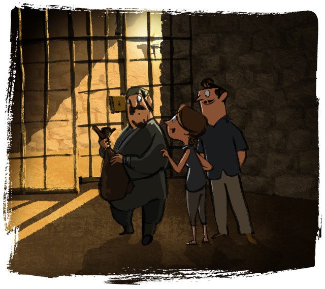 In the deep, daylight-free world of the dungeons it was difficult to keep track of time. Gerel continued to pass by on his regular patrols but in the wake of the devastating news about lunch I lost the will to make small-talk. Michael took to scratching idle doodles on the wall with a bit of stone to pass the time and I dozed fitfully. I seem to recall being in the midst of a delightfully tormenting dream about living in the shadow of a mountain made of shepherd’s pie beside a lake of beer when a jangle of keys brought me back to my senses. I looked up to find Gerel was unlocking the door to our cell. Standing beside him, bearing both a large brown sack and a peculiarly pensive expression, was Amak.