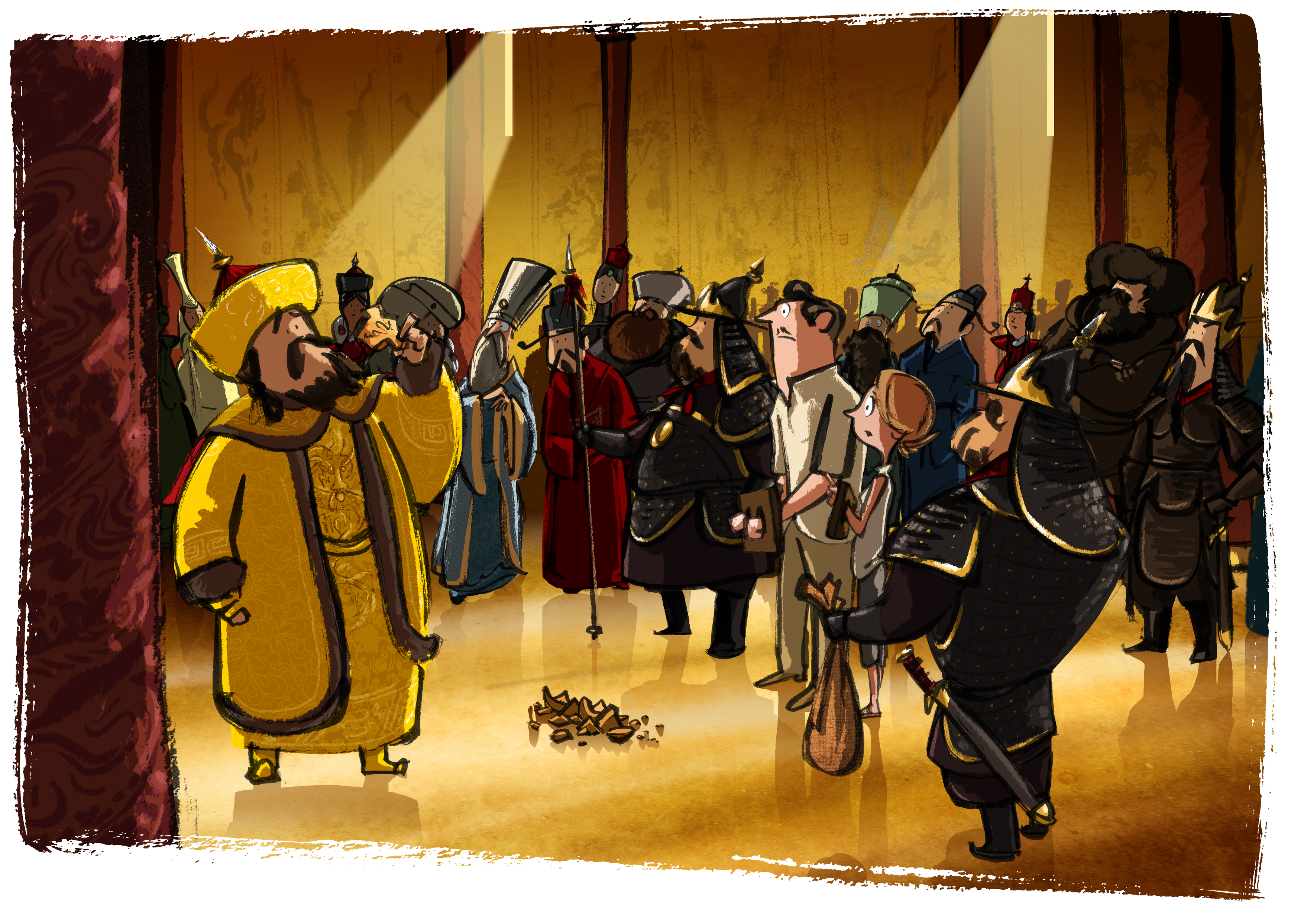 The hall that opened out before us was a long, high-ceilinged chamber. Images of nature – mountains, waterfalls and wild beasts – were painted upon or carved into every surface. Tall narrow windows cut dazzling patterns of light across a floor so highly polished that I was afraid that the moment I set foot upon it I would go shooting across like a hockey puck on an ice rink. All along the sides of the room were stationed members of the Emperor’s retinue, each lavishly dressed and standing stiffly to attention, whilst straight ahead, seated upon a grand throne and surrounded by his council of wise men, was the Emperor himself.