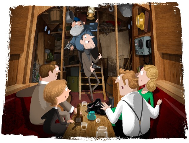 Sid looked uncertainly from the muzzle of the gun to the bag of jewels and back again. Then he lifted his gaze over Evil Sturridge’s shoulder and called out to Captain Dupree, still lurking in the doorway above, “So you were planning to sell us out this whole time, eh Dupree?”