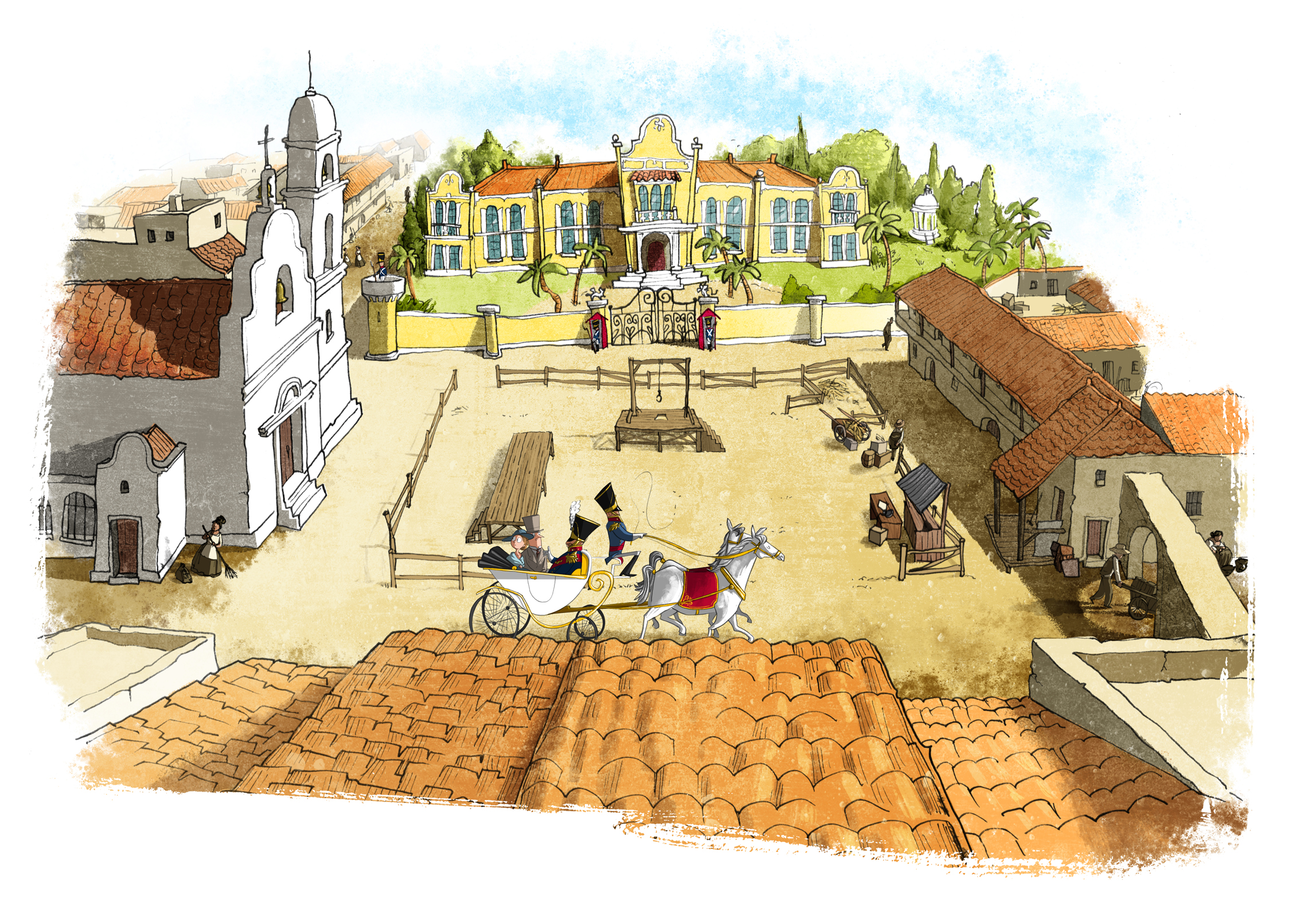 Arriving at our destination, I saw little to lift my mood. The town of Santa Marta apparently consisted of one broad, dusty square enclosed by a tangled web of narrow, dirty streets. There was barely any sign of life – I caught only a few pinched and worn faces peering glumly at us from doorways as we passed. Perhaps the afternoon sun, which burned fiercely, was keeping everybody out of sight. Or perhaps the townsfolk were just a bit embarrassed. After all, it was probably hard to rustle up any kind of civic pride in a town whose main feature appeared to be the gallows set up in the centre of the Plaza in anticipation of the next day’s hanging.