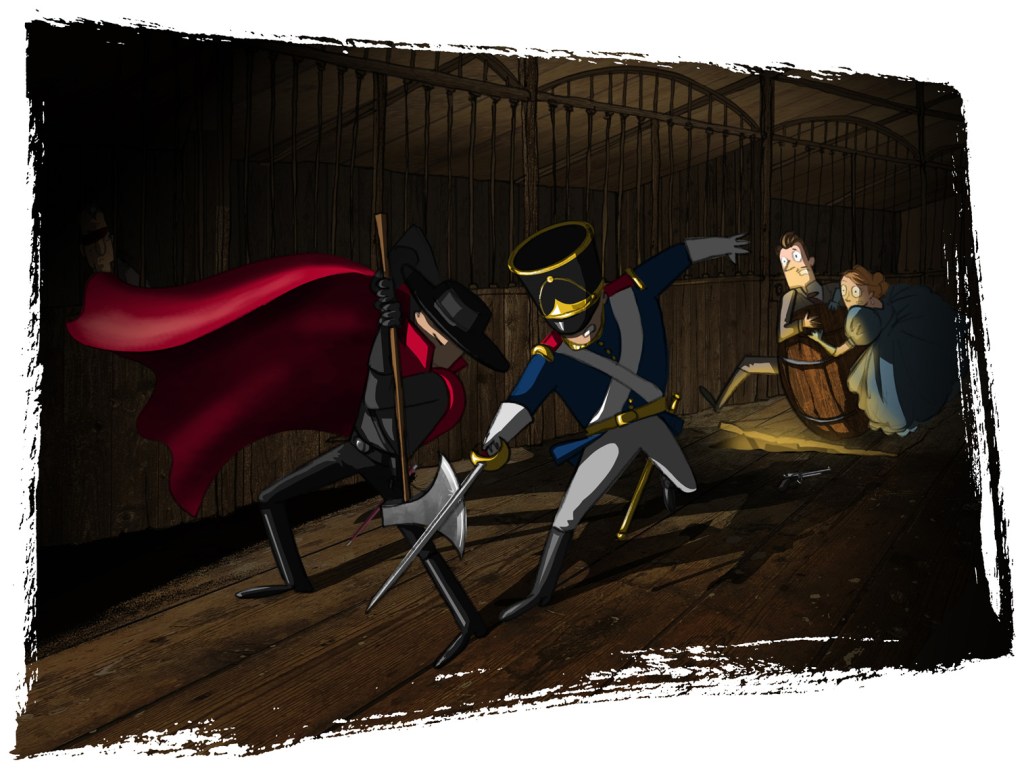 He was closely followed by a man in a dark red cape and wide brimmed hat who prodded him forward with a sword in one hand and the guard’s own rifle in the other. Through the open door we heard a brief snatch of sound from the courtyard outside – a confused medley of shouting voices, hurrying footsteps and the crackle of fire – before the man in the hat deftly pushed the door shut behind him with his foot and we were enclosed within the relative quiet of the stables once more.