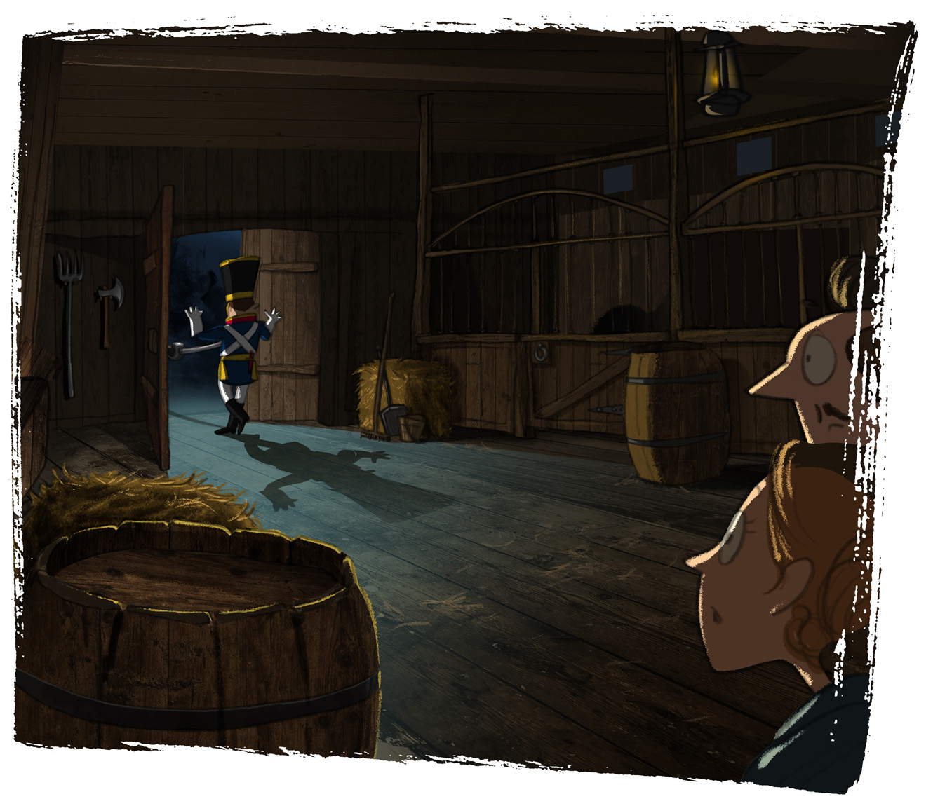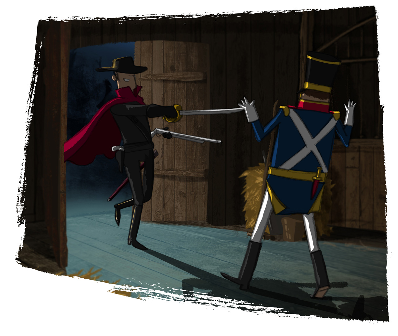 He was closely followed by a man in a dark red cape and wide brimmed hat who prodded him forward with a sword in one hand and the guard’s own rifle in the other. Through the open door we heard a brief snatch of sound from the courtyard outside – a confused medley of shouting voices, hurrying footsteps and the crackle of fire – before the man in the hat deftly pushed the door shut behind him with his foot and we were enclosed within the relative quiet of the stables once more.