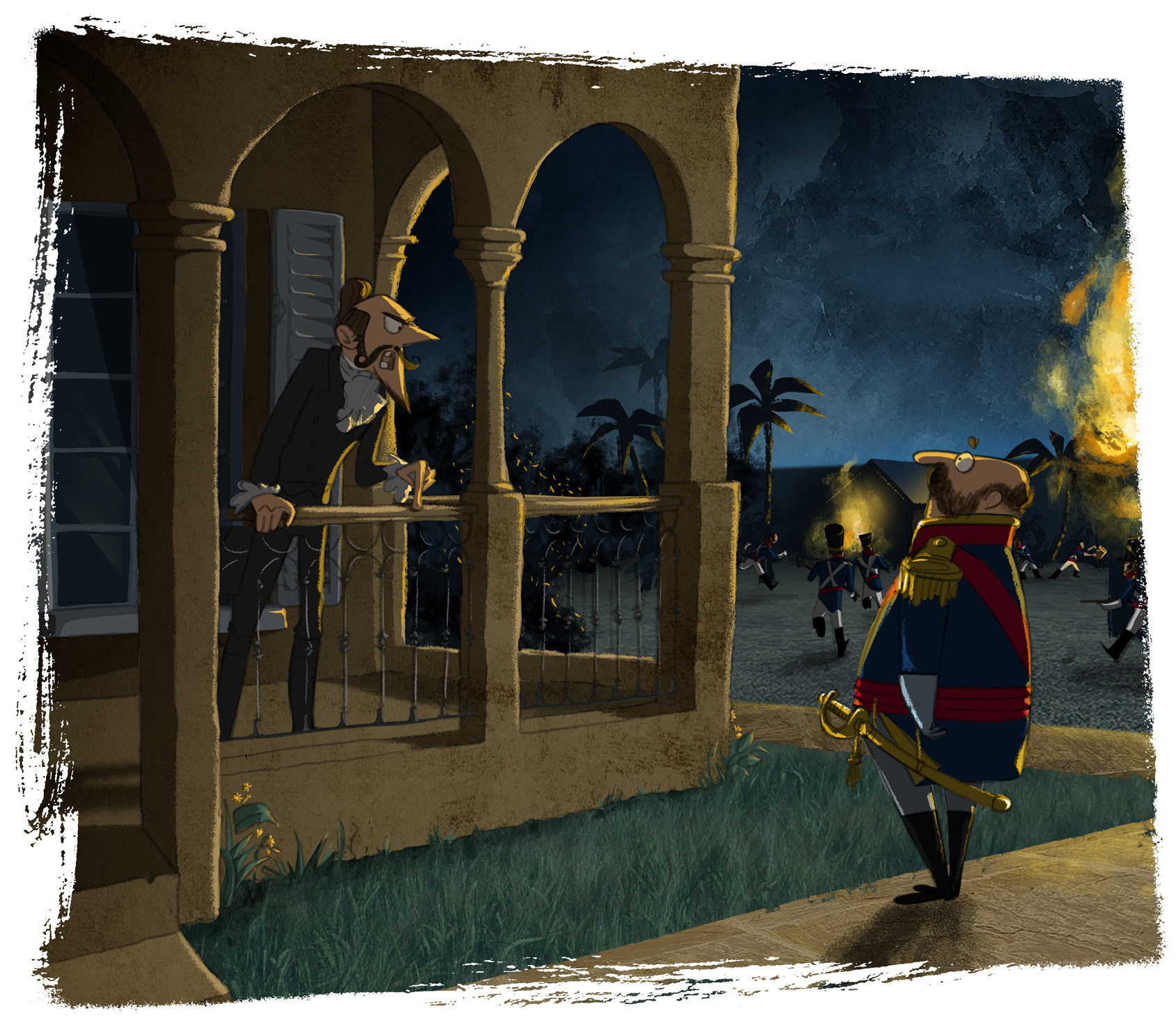 Michael and I skipped discreetly between the pockets of activity. It seemed we had made our move none too soon for barely a minute after we exited the stables a squad of heavily-armed guardsmen emerged from the house and charged towards the doorway, having presumably realised that their efforts to break in via the trapdoor were futile. Having circled cautiously around for a few more minutes, we finally felt secure enough to approach the veranda and discovered Don Pedro standing against the rail, staring impassively out over the courtyard and looking something like the captain of a grand ship watching the storm that swirls menacingly around his craft.