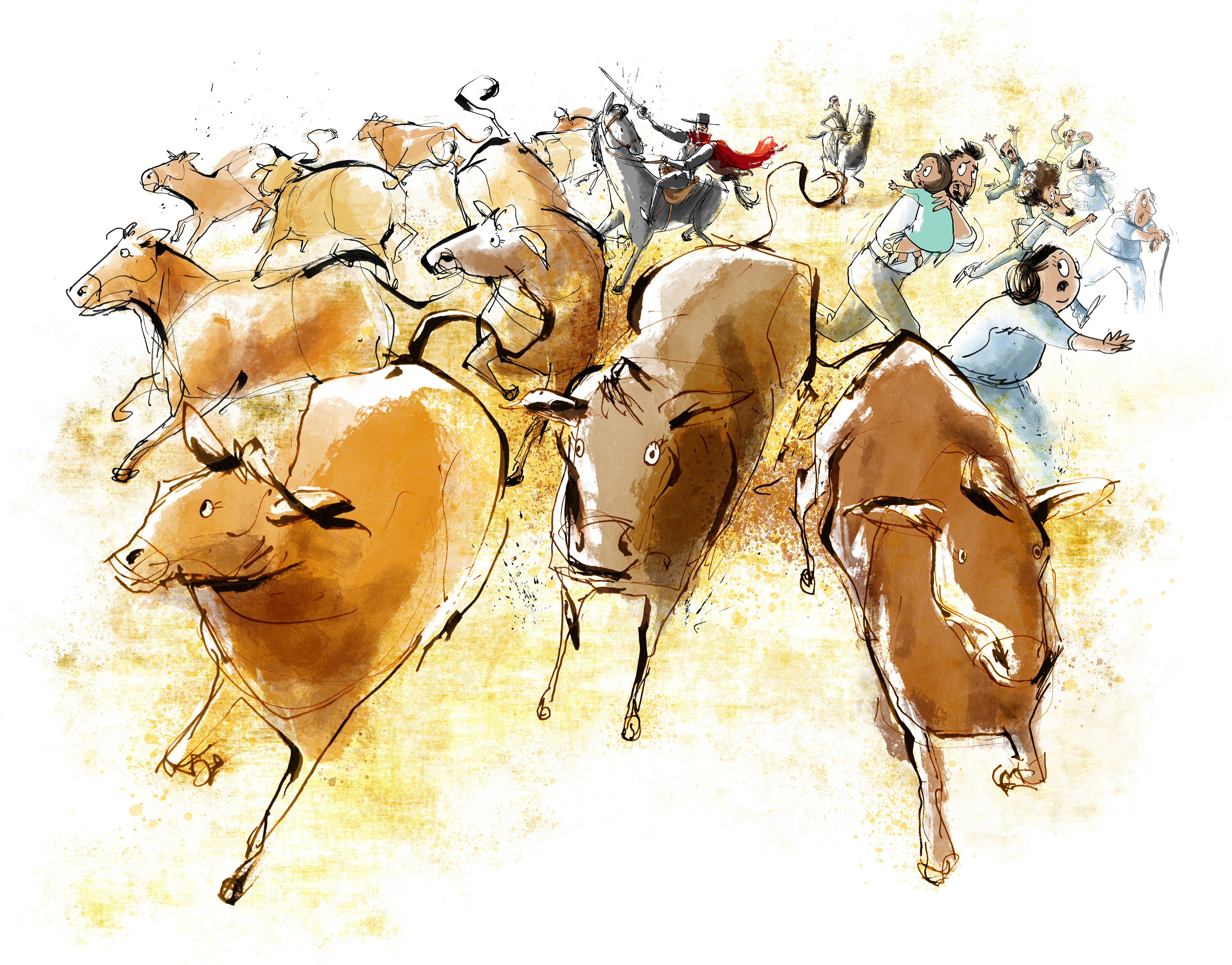 Ah, you may laugh little Moncho because you hear cattle and you think of Aunt Maria’s old milking cow, placidly chewing the grass in her back yard. But even old Hernandez is big enough that he could be quite a frightening sight if something had spooked him and sent him charging heedlessly towards you. Now imagine thirty, forty or even fifty such beasts, all snorting and bumping and jostling one another in fright, a great wave of solid beef about to trample you into the dust if you don’t get quickly out of its way.