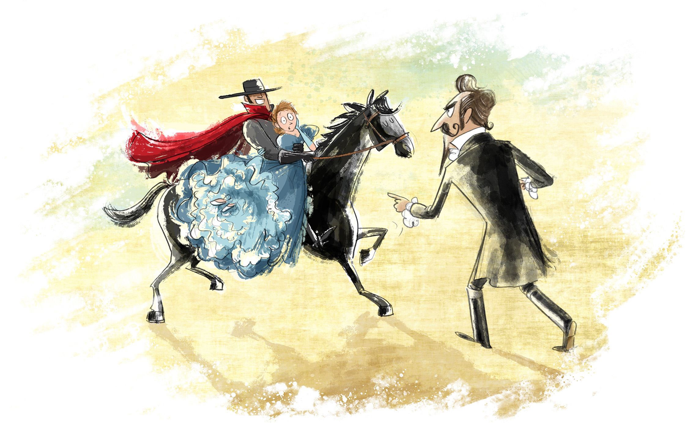 You are right to cheer, little Moncho, for never have I seen such a feat of breathless skill and daring. Juarez steered his way through the chaos straight up to the Governor’s platform and leapt onto it directly from his horse. The platform had been buffeted by the cattle as they charged past and the Governor’s party, knocked from their feet, were thrown about, clinging onto the wooden floor for dear life. Juarez, though, with perfect poise skipped lightly across the stage and delivered a swift kick to the Captain of the Guard, sending him rolling off the edge to land with a heavy thud on top of an unfortunate soldier sheltering below! By the time the stampede had passed by and the juddering stopped, Don Pedro, still fumbling around on his knees, looked up to find his adversary standing over him with his sword in his hand and a playful smile upon his face.